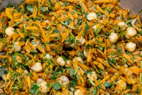 - Stir cilantro, parsley, carrots, and chickpeas into the seasoning blend and mix well.